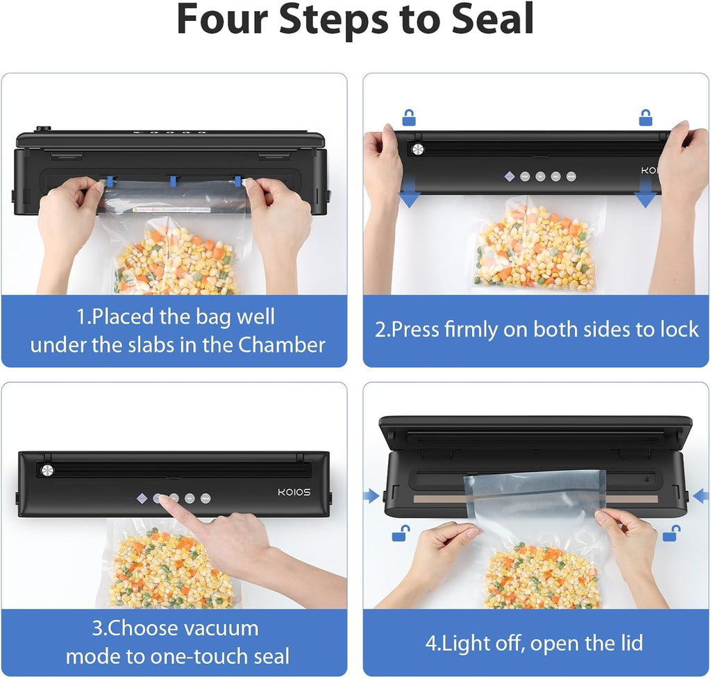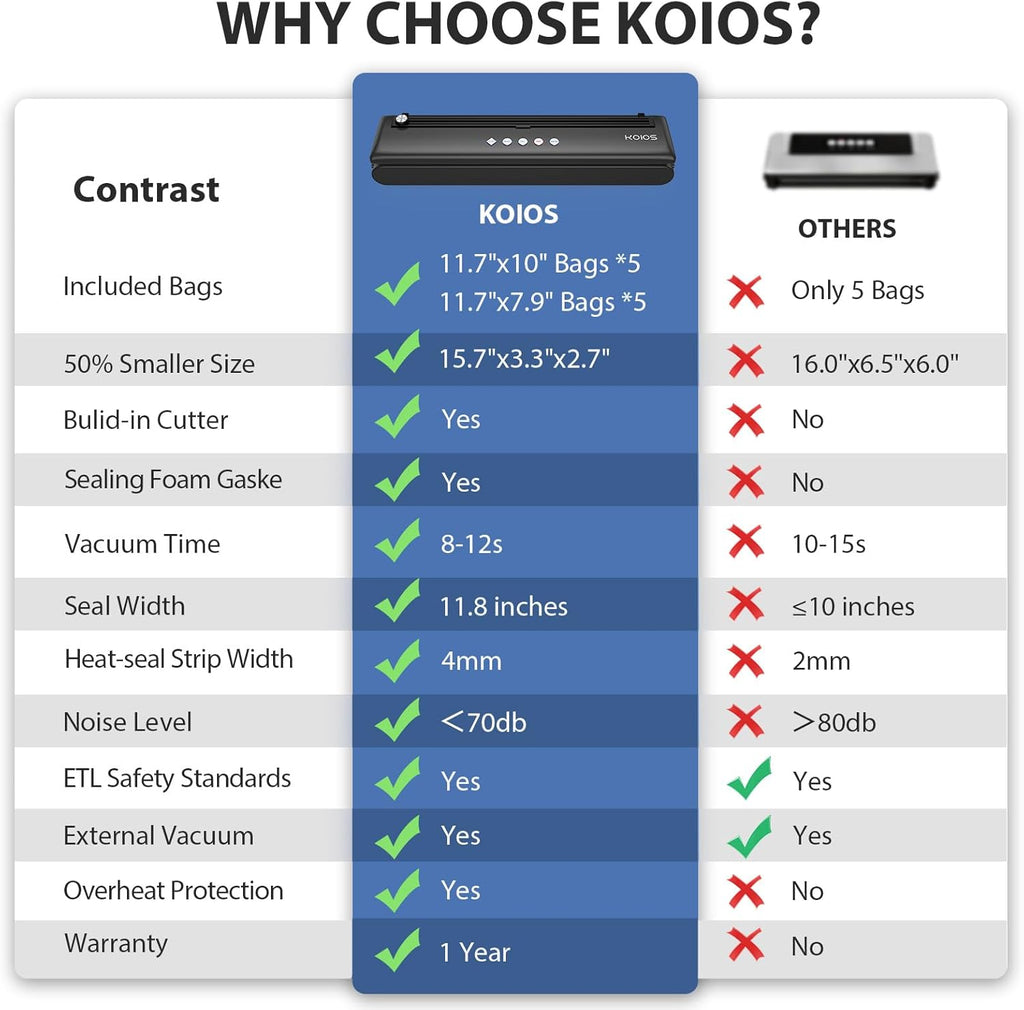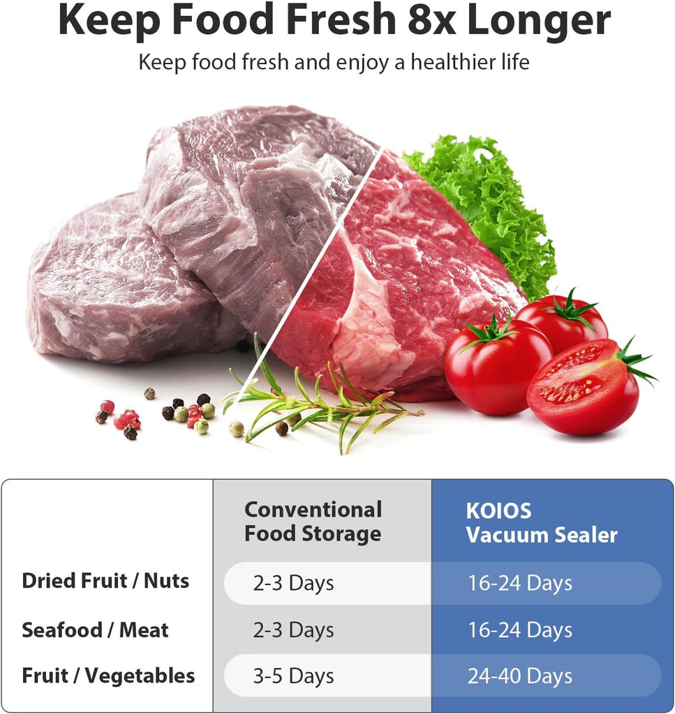 - RELIABLE VACUUM SEALER: This KOIOS vacuum sealer machine can complete the vacuum sealing in 8-12 seconds. It can keep food fresh for 8 times longer. Not only save your time and money, but also enhance the freshness of your meals.